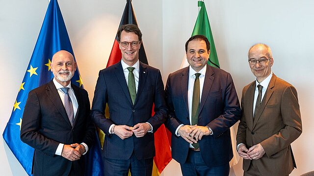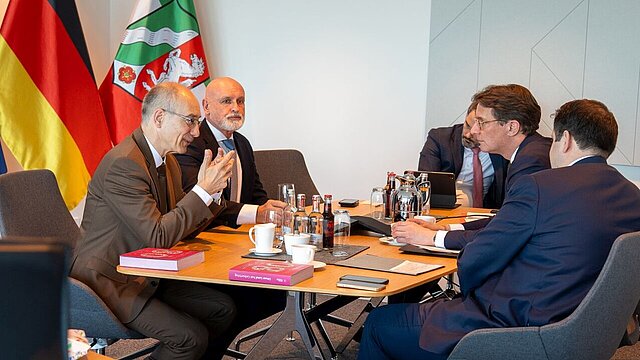 Zu seinem lang geplanten Antrittsbesuch weilte der Bundesvorsitzende des Deutschen Beamtenbundes (dbb) Volker Geyer in Düsseldorf. Neben einem Besuch der Landesgeschäftsstelle des DBB NRW stand weiterhin ein Gesprächstermin in der Staatskanzlei auf dem Terminplan. Gemeinsam mit NRW-Ministerpräsident Hendrik Wüst sowie Staatskanzleichef und NRW-Europaminister Nathanael Liminski diskutierten Volker Geyer, begleitet vom 1. Vorsitzenden des DBB NRW, Roland Staude, ausführlich die Belange des Öffentlichen Dienstes und die aktuellen beamtenpolitische Meinungslagen aus NRW-Sicht und in Bezug zur Bundespolitik.
