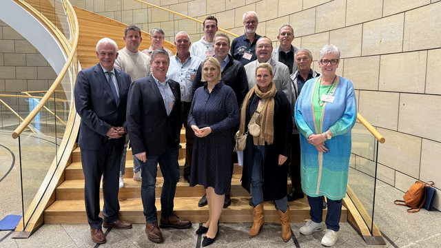 Danach ging es zu dem fußläufig gelegenen NRW-Landtag. Dort erhielt man zuerst einen allgemeinen Überblick über die Aufgaben des Landtages. Anschließend konnte die Delegation auf der Besuchertribüne an einer Plenarsitzung teilnehmen, wo u. a. die Änderung des Verfassungsschutzgesetztes NRW behandelt wurde, mit einer anschließend namentlichen Abstimmung. Abschließend gab es noch eine Diskussionsrunde mit den beiden Landtagsabgeordneten Charlotte Quik (für den Kreis Wesel) und Günther Bergmann (für den Kreis Kleve). Beide gaben einen Einblick in die tägliche Arbeit eines Landtagsabgeordneten. Außerdem stellte MdL Bergmann die große Wirtschaftskraft von Nordrhein-Westfalen mit seine 18 Millionen Einwohnern heraus. Auf die Frage nach der Zukunft des Berufsbeamtentums in NRW wurde deutlich, dass man ggf. prüfen müsse, evtl. nur noch hoheitliche Aufgaben durch Beamte ausführen zu lassen, da mittlerweile 36 Prozent des Landeshaushaltes für Personalausgaben ausgegeben werde.
