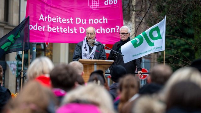 Auch in Düsseldorf haben über 200 Beschäftigte der Justizbehörden der Landeshauptstadt ihren Forderungen in der Einkommensrunde Nachdruck verliehen. „Ohne konkurrenzfähige Bezahlung verlieren wir die Menschen, die unser Gemeinwesen am Laufen halten. Gute Arbeitsbedingungen sind kein Luxus. Sie sind elementare Voraussetzung für funktionierende Schulen, Kliniken und Justizverwaltungen. Hier steht die Tarifgemeinschaft deutscher Länder (TdL) in der Verantwortung. Öffentliche Daseinsvorsorge gibt es nicht mit Beschäftigten am Limit, sondern nur mit Respekt und guter Entlohnung“, sagte Roland Staude, Vorsitzender des DBB NRW am 9. Dezember 2025 in Düsseldorf.
